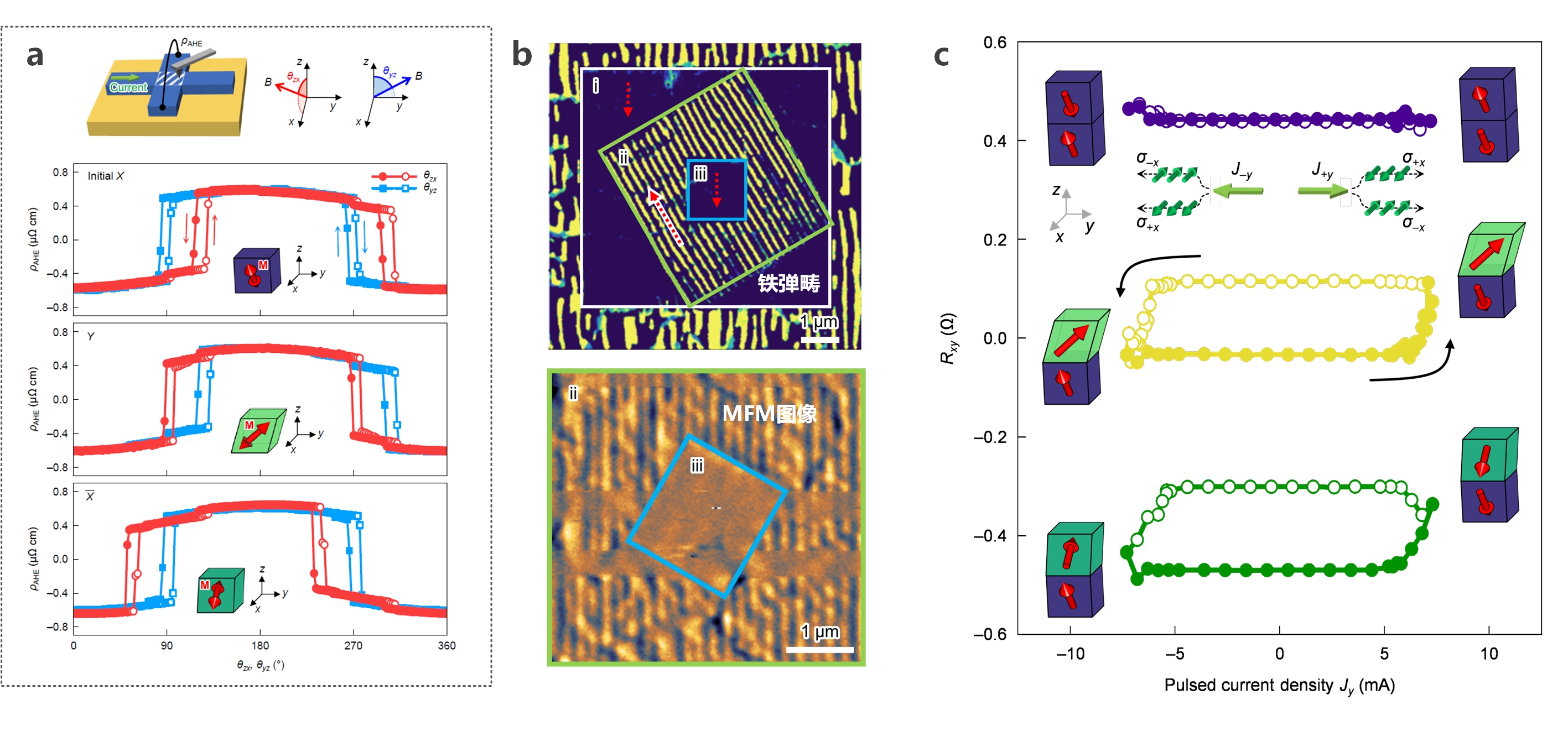 3 a)基于晶向选择的铁磁各向异性调控;(b)机械写入的铁弹畴织构的电子通道对比度(ECC)图像及对应磁力显微镜(MFM)图像;(c)具有不同设计的铁磁各向异性垂直不均匀性的SrRuO3001)的无场自旋轨道矩(SOT)切换回线