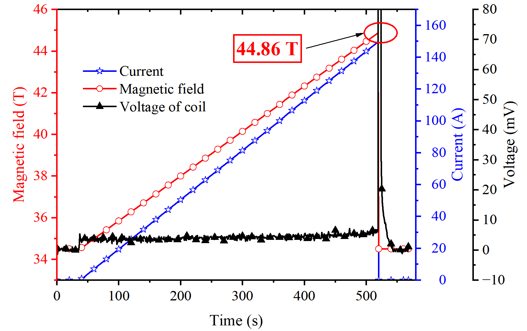 近日,中国科学院合肥物质院强磁场科学中心匡光力/蒋冬辉课题组在高场超导磁体技术领域取得重要进展。研究团队利用国产稀土钡铜氧(REBa2Cu3O7-x)高温超导带材绕制的“口袋”型内插高温超导线圈,在液氦零背景场下产生28.20 T磁场,并在稳态强磁场实验装置WM5水冷磁体34.5 T的背景场下产生10.36 T磁场,总体磁场达44.86 T。