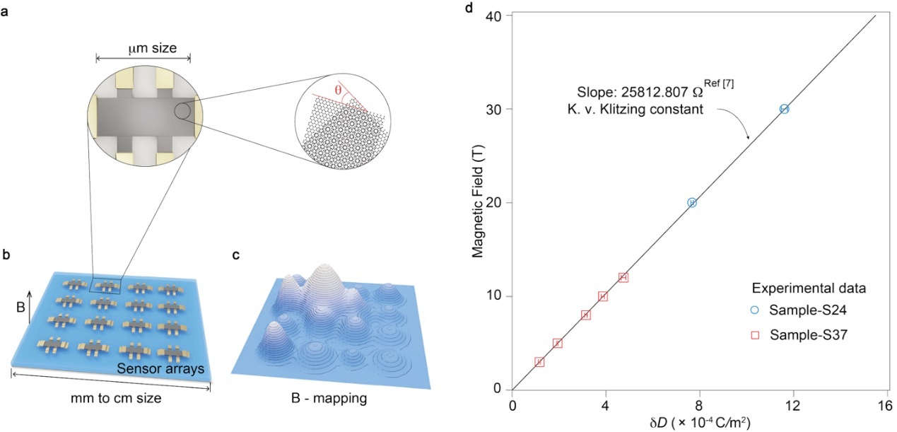 研究团队利用水冷磁体WM1的电输运测试系统验证了δD/B在宽磁场范围内(3到30 T)均保持在e2/h附近的量子化数值。基于此,团队提出了一种新型的低温磁传感方案(图3),利用磁场B与临界电位移场间隔 D之间的线性关系(其斜率即为冯·克利青常数Von Klitzing constant,h/e2),只要通过测量量子化“中国结”的间距(图3. d),即可反推出磁场强度B。这种传感器原则上具有较高空间分辨率(图3. a-c),有望成为低温强磁场场景下的新原理磁强计。