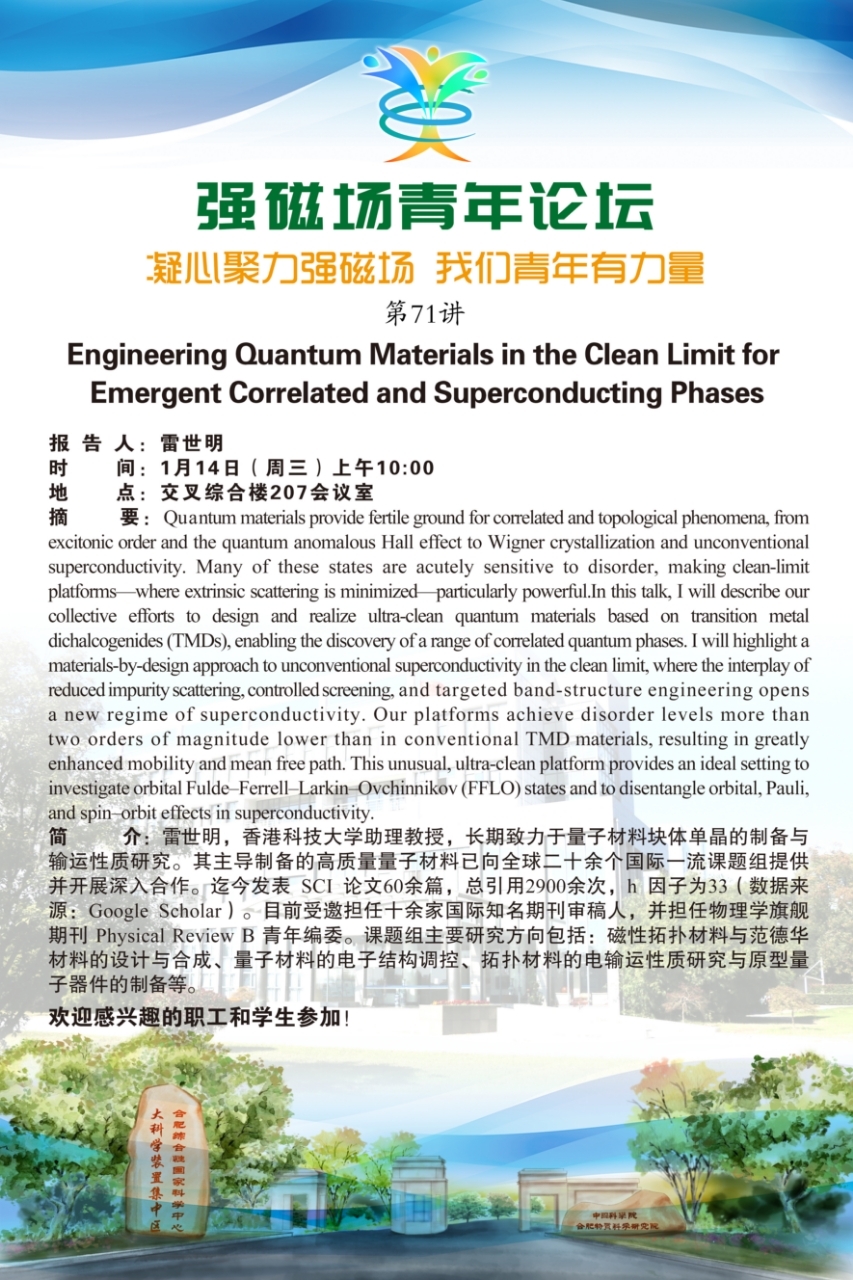 强磁场青年论坛第71讲:Engineering Quantum Materials in the Clean Limit for Emergent Correlated and Topological Phases
