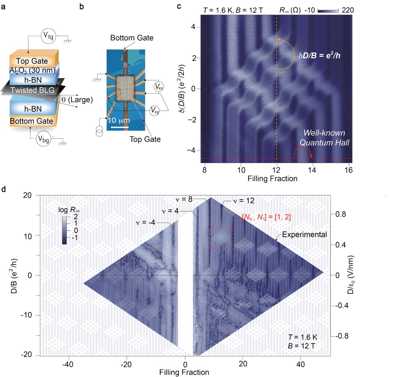 研究团队发现大角度转角双层石墨烯器件在低温强磁场环境下展现出独特的层间弱耦合特性,朗道能级交叉点在调节垂直电位移场(D)和载流子浓度(n)参数空间中形成了一种尺寸均一的44“中国结”状纵向电阻图案(图1)。研究表明这种特殊的“中国结”特征源于电场驱动的层间电荷转移相变:在朗道能级交叉处,垂直电场驱动电荷在上下两层朗道轨道之间转移(图2. a-b),这种朗道能级约束下的电荷转移机制导致了临界电位移场间隔(δD)的量子化,其数值等于e/2πlB2(其中lB为磁长度)。该双层朗道能级交叉“中国结”内电子相之间切换的临界电场主要取决于电场驱动的层间极化与库伦相互作用主导的电容能之间的竞争。