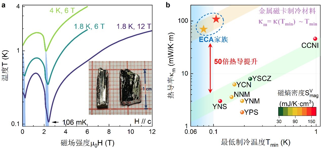 图3. a,ECA材料的绝热去磁制冷测量,在自旋超固态量子相变点附近实现106 mK最低制冷温度;b,ECA材料的热导具有巨大优势,相比于此前报道的磁制冷材料,其热导率提升了1–2个数量级