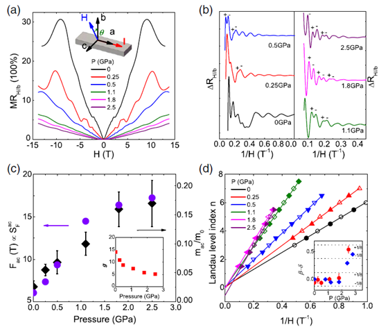 不同压力下ZrTe5的(a)磁阻(b)量子振荡(c)ZrTe5量子振荡频率以及有效质量随压力的变化(d)不同压力下,ZrTe5朗道指数随磁场倒数的关系。
