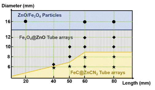 在一端封闭的小口径瓷管中热分解预先合成的片状双金属前驱物,在600°C生成FeC纳米颗粒@ZnCN2纳米管复合材料(图2),在900°C生成奥氏体/Fe纳米颗粒@碳纳米管复合材料(图3),这与常规瓷舟中获得的氧化物产物均不相同。进一步设计实验,研究反应器“长径比”对化学反应的影响(图4),在不同长径比的容器中分别获得了ZnO/Fe3O4纳米颗粒、Fe3O4@ZnO 纳米管阵列和FeC@ZnCN2纳米管阵列三种不同成分、不同形貌和不同组装方式的纳米结构材料。研究人员甚至可以根据反应容器的不同“几何形状参量”来画一个反应产物的“相图”(图5)。