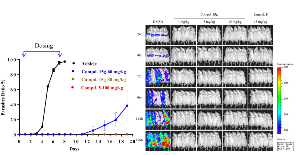 在抗疟疾药效学实验中,该药物表现出了良好的剂量依赖关系,并且在80 mg/kg剂量下能够全部清除红内期疟原虫感染,在 1mg/kg剂量下能够全部清除肝内期感染,这表明,CHMFL-PfPI4K-127同时具有潜在的治疗和预防抗疟的作用。