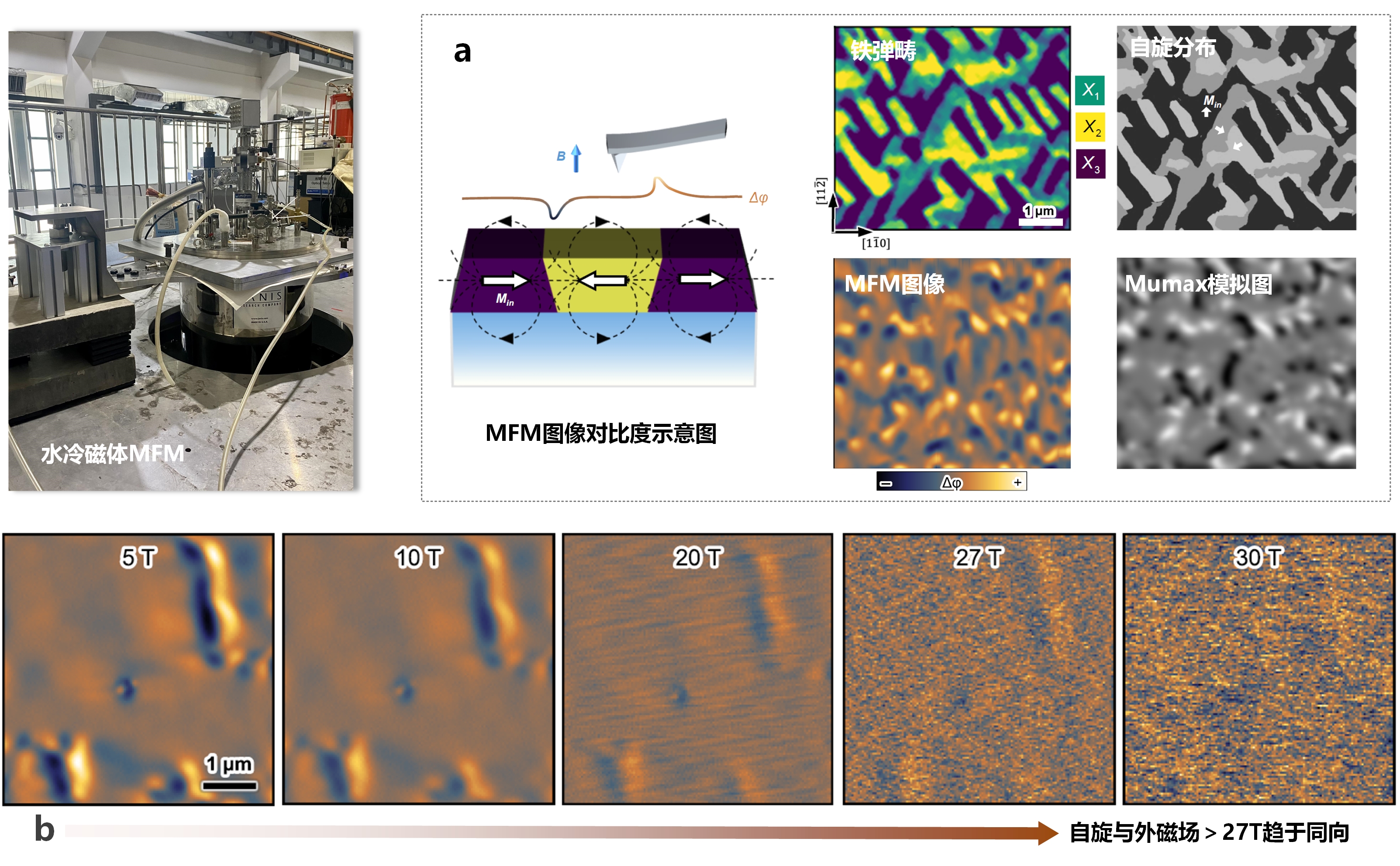图1水冷磁体磁力显微系统实物、测试及铁弹耦合铁磁畴图像:(a)展示了由畴壁处面内分量分布区别导致的磁对比度示意图;同一区域采集铁弹畴、MFM及微磁学模拟图像对比;(b)5 K下磁畴随磁场0-30 T下演化过程。