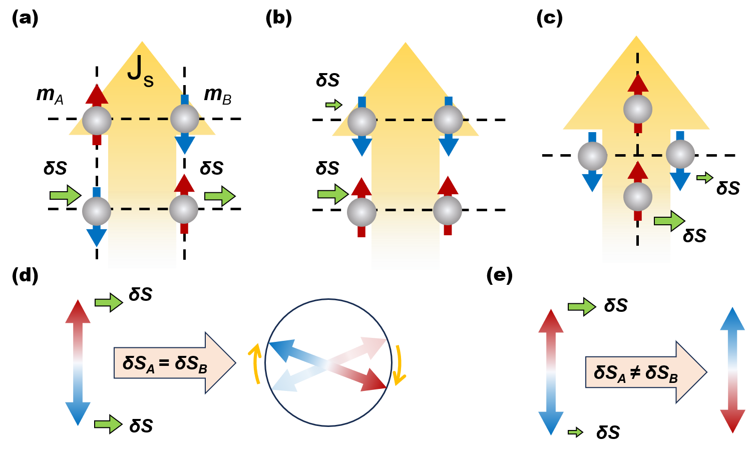 图1. 反铁磁体系中非对称自旋力矩(Asymmetric Spin Torque)的物理机制示意图。结合实空间子晶格的堆叠特性与界面截断效应,注入自旋流在反铁磁A、B子晶格上可以呈现出不平等的自旋积累现象。由此产生的非对称自旋力矩有效打破了动力学平衡,驱动奈尔矢量实现确定性翻转。