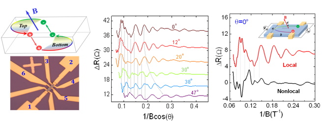 费米弧作为一种特殊的手性边界态,原则上能通过非局域(nonlocal)的探测方法探测到。为了探索如何从较大比重的体态中提炼出表面态量子振荡信号,最近田明亮课题组研究人员利用化学气相沉积(CVD)方法生长出了较大尺寸的Cd3As2纳米片,并详细研究了其在局域(local)以及非局域探测下的量子输运特性。输运研究显示,这些CVD生长的Cd3As2纳米片在高场下展现出了多频的局域量子振荡图案。随后的转角测量发现高场下额外出现的量子振荡呈现出了二维的振荡特性。结合理论分析,研究人员发现这些局域的二维振荡源于拓扑半金属所特有的Weyl磁轨道。进一步研究表明,这些局域的二维表面态量子振荡信号在非局域探测中被显著地放大了。而另一方面,局域的体态量子振荡信号在非局域的探测中得到了极大地抑制。该项实验研究表明,非局域探测是研究拓扑半金属Cd3As2中费米弧表面态的一种非常有效的办法,也适用于其他的Dirac/Weyl半金属体系。