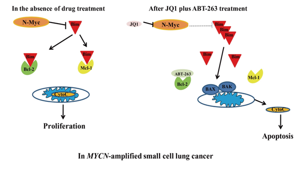 课题组发现N-MYC扩增的小细胞肺癌细胞系对表观遗传药物-BET bromodomain抑制剂JQ1非常敏感。并且他们发现JQ1通过抑制N-MYC诱导BIM蛋白的表达,从而使N-MYC扩增的小细胞肺癌细胞对BCL-2抑制剂ABT-263更加敏感。JQ1和ABT-263的联合处理有效地干扰BIM与BCL-2和MCL-1的结合,从而使BIM发挥作用诱导细胞凋亡。课题组进一步在小细胞肺癌小鼠移植瘤模型中证实JQ1和ABT-263的联合使用有效地抑制N-MYC扩增的小细胞肺癌移植瘤的生长。这项研究工作表明JQ1和ABT-263的联合使用可能是一种有效治疗N-MYC扩增的小细胞肺癌的方法,具有潜在的临床应用价值。