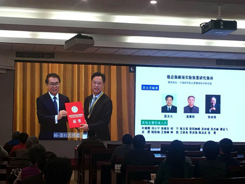 1月23日,中国科学院举行2017年度杰出科技成就奖颁奖典礼,院长白春礼为各获奖代表颁发了奖章和获奖证书,其中匡光力研究员代表稳态强磁场实验装置研究集体上台领奖,中科院所有院属单位通过视频共同见证了这一重要时刻。