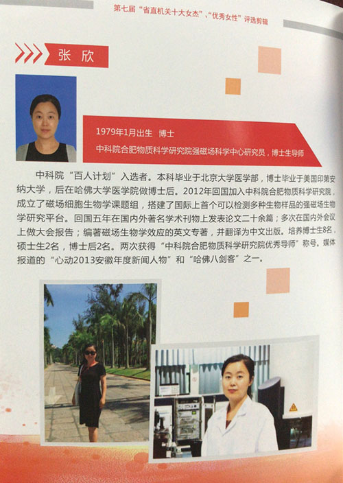 张欣研究员2001年本科毕业于北京大学,2007年博士毕业于美国印第安纳大学,2008-2012年在哈佛大学医学院做博士后。2012年回国加入合肥研究院。她成立了磁场细胞生物学课题组,成功搭建了国际上首个可以用来检测多种生物样品的强磁场生物学研究平台,重点研究磁场生物学效应,并取得了显著成绩。例如,依托强磁场大科学装置,发展了溶液扫描隧道显微镜检测生物样品的技术,实现了在近生理状态下对蛋白样品的纳米尺度成像,并建立了可以在≥20T稳态强磁场下研究多种生物样品的研究平台,系统性利用了0-27T不同磁场强度和多种组织来源和遗传背景的肿瘤与非肿瘤细胞,在稳态磁场的肿瘤细胞生物学效应方面取得了一系列成果。回国五年多来,以第一或通讯作者身份在eLife、Nano Research等国际知名杂志上发表SCI论文和著作章节22篇。研究成果共被他人引用800余次。入选中科院科技创新交叉团队,主持多项国家自然科学基金。她受邀为国际知名的Springer杂志社负责编写了“Biological effects of static magnetic fields”专著,并指导学生将其翻译为中文。此外,她还受邀在全国细胞生物学大会、第536次香山科学会议、第十六届全国磁学和磁性材料会议、第三届凝聚态物理大会以及在法国举行的2017年国际磁学会等多个学术会议上做邀请报告,在磁生物学方面做出了突出贡献,产生了显著的国际影响力。