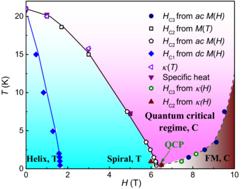 为了探寻这个未知新相的物理本质,团队研究人员通过极低温和强磁场下的物性测量,拓展了ZnCr2Se4材料的温度-磁场相图,实验确定该新相存在于临界磁场HC2和HC3之间,HC2随着温度降低逐渐向高场移动,而HC3逐渐向低场移动,并最终重合在一个量子临界点,表明绝对零度下螺旋自旋序到完全极化态之间的转变为量子相变,而在HC2和HC3之间存在的未知新相为磁场诱导的量子临界区域(如图1所示),该量子临界区域具有不寻常的临界模式,不能被简单的Ising或者Gaussian临界模型所解释;在量子临界点附近(6.5 T),比热在极低温下符合T2的指数关系,同时热输运上显示出平均自由程不随温度变化。该工作为阻挫量子临界行为研究提供了新的思路。