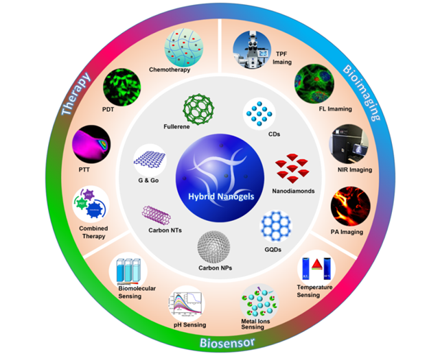 近年来,课题组以碳量子点(碳点)为基础,通过从材料结构到表面性质认识碳点的特性,在刺激响应型复合纳米凝胶的合成方面做了大量的工作。利用简单的沉淀聚合法以及非溶剂胶体形成法,设计了具有稳定光学性质的温度/pH/葡萄糖/近红外/磁场等刺激响应型复合纳米凝胶,实现了其在光学传感器、荧光成像、刺激响应型药物释放以及癌症的复合治疗等功能于一体。相关碳基纳米材料和复合凝胶研究成果发表在《先进材料》、《先进功能材料》、《生物材料》等国际期刊。