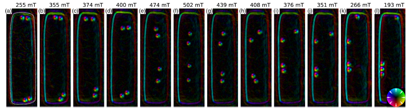 团队人员利用前期积累的聚焦离子束精确控制纳米条带中磁斯格明子数目的样品制备技术, 制备了宽度精确可控的纳米条带,并利用洛仑兹投射电镜技术研究了FeGe纳米条带中磁斯格明子在磁场调控下的运动规律,首次实验上证实了理论预言的三维磁斯格明子之间存在吸引相互作用以及外磁场可调的吸引-排斥相互作用。该工作对相关的器件设计具有重要的意义。