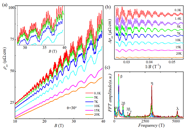 图1. 层状PtBi2单晶在40T混合磁体上测量的不同温度下的磁电阻和量子振荡行为。