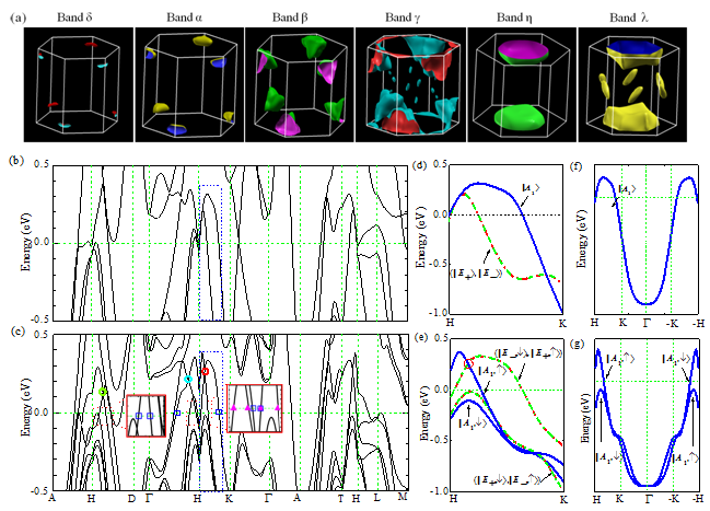 图2. 理论计算给出的6个3D 费米面和能带色散关系, 其中图(e)清楚给出了三重简并费米子。