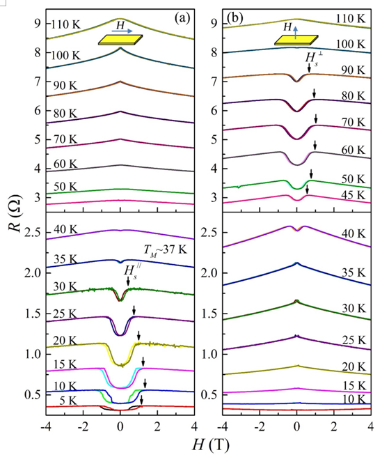 该研究实验发现:纳米薄片的第一个磁转变温度不随厚度变化,而第二个磁转变温度TM会随着样品厚度的减薄而降低,且其各向异性磁阻总是会在TM处发生正负反转,如图1所示。即当外加磁场方向沿着c轴(或平行ab-面)时,在TM<T<TC,其磁阻信号为正(或负),而在T<TM,其磁阻信号为负(或正)。这一结果充分表明纳米薄片中的磁矩随着温度的降低在TM处发生了从ab面到c方向的翻转。