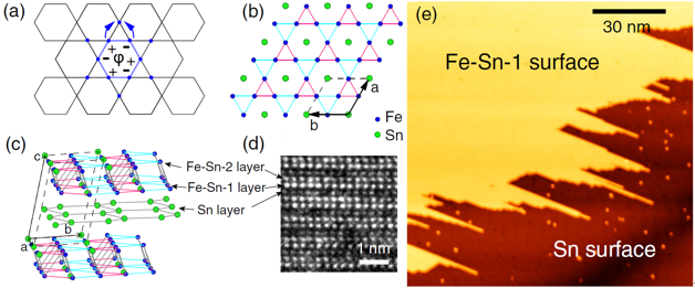 图1.(a)Kageme lattice中正六边形结构上的波函数示意图。 (b),(c)块材Fe3Sn2结构的俯视图及侧视图。(d)Fe3Sn2截面图的TEM图像。(e)Fe3Sn2的大范围STM图像
