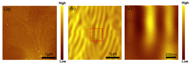 图2.(a)Fe3Sn2的AFM图像。(b)大范围MFM图像。(c)图b中红色区域MFM图像