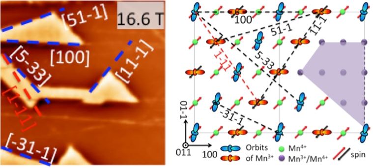 关联电子晶体在强磁场下的磁力显微图像(左)与对应的电子态示意图(右),其中,电子晶体的边界方向与电子的多自由度共同程序的方向高度吻合。