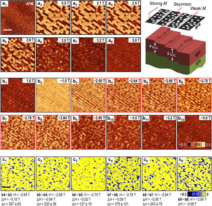 强磁场中心的陆轻铀课题组利用自主研制的高灵敏MFM,直接观测到了该系统中的skyrmions, 这也是首次在氧化物薄膜中观测到skyrmions。