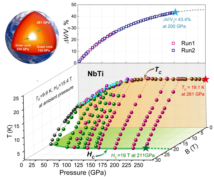 铌鈦合金在数千种已知的超导体中以其优异的综合性能得到广泛的应用,是目前医用核磁共振和大科学装置超导磁体中的关键材料。孙力玲课题组前期在对由多元过渡族金属元素组成的高熵合金超导体(TaNb)0.67(HfZrTi)0.33的研究中发现,在超高压力下(百万大气压以上的压力为超高压力,100万大气压=100 GPa),该合金表现出异常稳定的超导电性【PNAS (2017) 114,13144】。由于铌和鈦是这种高熵合金的主要构成元素,通过对铌鈦合金超高压力下超导电性的研究,能加深对高熵合金超导的微观机制的理解。