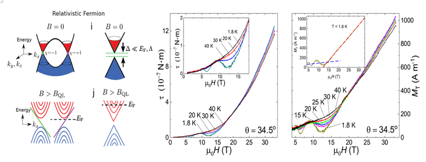 磁性反映了电子的热力学行为,目前在量子极限之上对这些相对论粒子体系磁性的实验研究相对较少。依托于稳态强磁场装置水冷磁体,张警蕾副研究员等人利用悬臂式磁扭矩测试设备,对外尔半金属TaAs强磁场下的磁性质进行了深入研究。实验研究结果显示,进入量子极限以后,TaAs的有效横向磁化强度和平行磁化强度均随着磁场呈线性增长。进一步的理论计算结果显示,非相对论粒子体系的磁化强度会在量子极限之上达到饱和;而相对论粒子体系的磁化强度则会出现不饱和的增长。因此TaAs 在强磁场下表现出的这种非饱和的磁化强度正是相对论性粒子在量子极限之上热力学性质的独有特性。