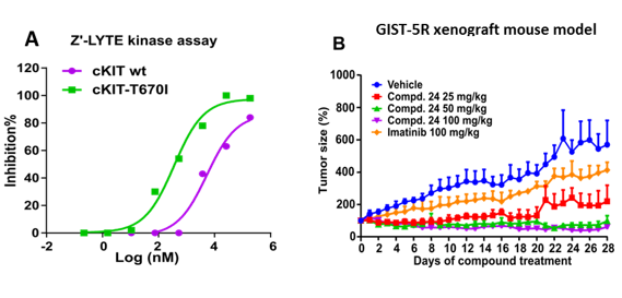 胃肠间质瘤(GISTs)是一种恶性程度极高的胃肠道癌症,c-KIT激酶的功能获得性突变在胃肠间质瘤的发生发展中起着重要作用。临床上用于治疗GISTs的一线药物是伊马替尼(商品名:格列卫),但46-67%的病人会在c-KIT激酶区产生耐药突变,比较多的是位于c-KIT激酶gatekeeper位置的T670I突变。鉴于c-KIT激酶野生型在一些生理功能如造血功能中起重要作用,因此发展c-KIT T670I耐药突变选择性的抑制剂能够提供更好的用药安全窗口。