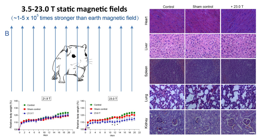 本研究领域需要考虑的因素包括磁场强度、处理时间等。团队成员前期进行了小规模的实验,检测了3.7-24.5T强磁场对荷瘤小鼠的影响,处理时长9小时,可以对肿瘤生长产生一定的抑制作用。虽然小鼠的大多数生理生化指标无显著异常,但是其肝脏受到了强磁场的影响(文章链接:https://doi.org/10.1088/1674-1056/27/11/118703)。基于前期的实验基础,团队成员降低磁场强度,缩短磁场处理时间,采用112只C57BL/6J正常小鼠,在3.5-23T强磁场下、处理时长由原来的9小时缩短为2小时,之后继续正常饲养三周,全面系统地检测了其生物安全性。通过病理切片、血常规检测和血液生化分析等,发现本次3.5-23T强磁场/2小时处理时长并未对小鼠的主要脏器(心、肝、脾、肺、肾),血常规指标以及肝肾功能、脂质代谢和离子浓度等主要生理指标造成明显危害。虽然23T处理组小鼠的摄食和体重增长受到了一定影响,但是21.9T及以下的强磁场则无明显影响。此项研究对界定强磁场生物安全界限,开拓强磁场在医疗和仪器设备等领域中的应用都具有积极的指导意义。