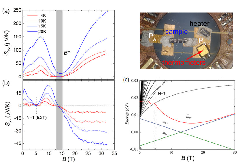 图:ZrTe5(a)塞贝克系数以及(b)能斯特效应随磁场的变化关系。(c) 理论计算ZrTe5朗道能级随磁场的变化关系。右上:水冷磁体热电效应测试装置。