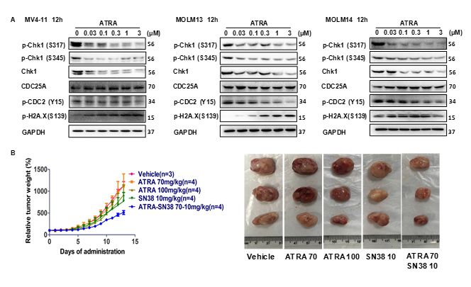 (A) ATRA下调FLT3-ITD阳性白血病细胞中的Chk1,(B) ATRA和DNA损伤药物SN-38联合能显著延缓肿瘤生长。