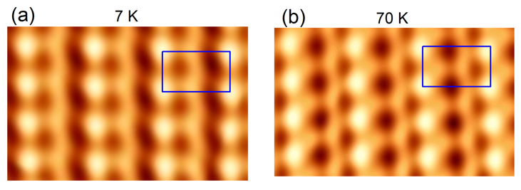 图1. Td相MoTe2在T = 7 K(a)和70 K(b)时的原子分辨率表面STM图像。 蓝色矩形表示二维原胞【Phys. Rev. B 96, 075132 (2017)】。