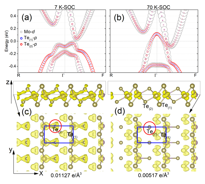 图2. 温度为7K(a)和70K(b)时包含自旋轨道耦合的GGA能带结构。 圆圈的尺寸代表不同轨道对能量态的贡献。(c)和(d)分别是7K时低于价带顶0.1eV的占据态,和70K时费米能级以下0.1eV占据态的分波电荷密度。蓝色矩形代表二维原胞。
