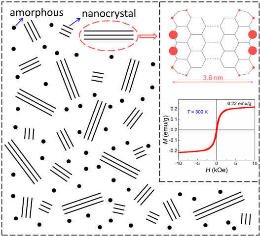 目前,大多数二维磁性是通过机械剥离三维磁性晶体来实现的。这类体系的本征居里温度普遍较低(< 250 K)。提高居里温度,除了元素掺杂、外场调控,缺陷工程也是重要的备选方案之一。已有理论和实验证实,在非金属、轻元素系统中的s-p电子间也可以建立强的磁性耦合,而且有可能实现高于室温的转变温度。因此在原本的非磁二维材料上,通过缺陷工程(掺杂、吸附、点缺陷、边缘、自由基等)引入磁性也是极具前景的,这种非本征磁性有望实现更高的转变温度。通过合作研究,项目组用武兹反应合成内嵌石墨纳米晶的无定形碳纳米片,并发现由石墨纳米晶的锯齿形边界(zigzag edge)引起的室温铁磁强度可达0.22 emu/g,比此前报道的点缺陷诱导的石墨室温铁磁强度大两个数量级。结合进一步的实验和第一性原理计算,研究者发现碳纳米片的磁性主要依赖于锯齿形边界间的距离,随着距离由3.6nm减小0.8nm,边界间的磁性耦合由铁磁转变为反铁磁。室温铁磁性是二维磁性材料走上应用的前提,这些发现为碳基磁性材料的应用提供了可行性。