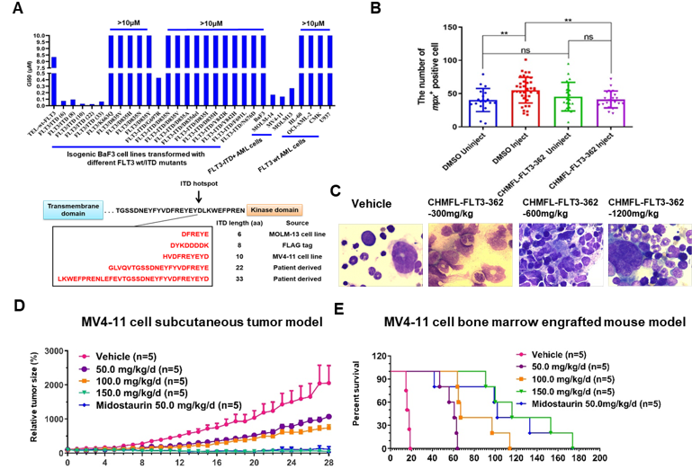 在蛋白、细胞、动物层次上的研究表明,CHMFL-FLT3-362除了进一步提高了在FLT3-ITD与wt-FLT3等激酶间的选择性之外,与已上市的FLT3抑制剂米哚妥林(Midostaurin)相比,能够显著降低斑马鱼模型的尾部畸形的出现。在连续给药14天的小鼠模型实验中,也没有引起明显的骨髓抑制毒性。这些实验结果进一步验证了FLT3-ITD突变选择性的小分子抑制剂在临床应用上可能具有更好的安全性。此外,CHMFL-FLT3-362在SD大鼠、KM小鼠及Beagle犬中表现出良好的药物代谢动力学性质。在动物体内药效评价方面,在MV4-11细胞皮下移植瘤的小鼠模型上,CHMFL-FLT3-362在150 mg/kg/day的剂量下的抑瘤率(TGI)高达95%,并且在MV4-11细胞原位瘤的小鼠模型上能够显著延长动物的生存时间。