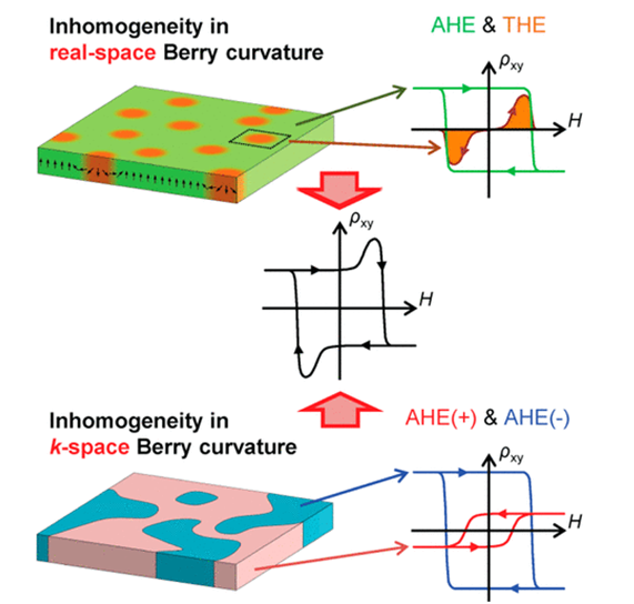 图1:SRO中霍尔测量异常的两种可能:THE成因(图片上排)和不均匀AHE叠加(图片下排)