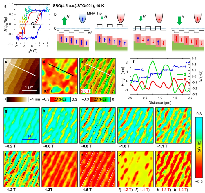 图2:MFM测量结果。(a) 4.5 u.c. SRO薄膜M-H曲线。(b) 4.5 u.c. SRO薄膜样品示意图,一个台阶宽度上实际包括4 u.c.与5 u.c.两种不同厚度(c)AFM形貌图。(d-p)MFM测量结果。图e所示,2 T饱和磁场下,4 u.c.与5 u.c.两种不同厚度表现不同的对比度。