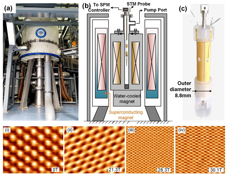 混合磁体STM系统:(a)混合磁体照片;(b)混合磁体STM系统简图;(c)STM镜体;(i-iv)分别为0T、21.3T、28.3T、30.1T磁场强度下石墨的原子分辨STM图像。