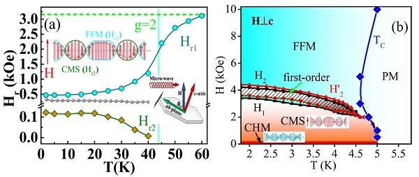 图:(a)手性磁孤子材料MnNb3S6对微波的响应;(b)手性磁孤子材料YbNi3Al9的H-T相图