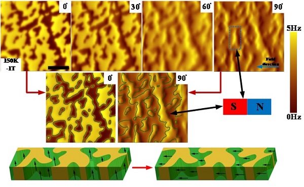 研究团队通过改造其发明的“蜘蛛马达”结构,制作出了小而紧凑的磁力显微镜镜体,摆脱了7 T超导磁体孔径对镜体尺寸的限制,很好地实现了磁力显微镜整个镜体在超导磁体孔径中的旋转,从而磁体的最高场可在整个0到90度的样品夹角范围施加于待测样品;同时测量温度可覆盖从液氦低温到室温的很宽范围。研究团队利用该装置对La2/3Ca1/3MnO3 (NdGaO3衬底) 40 nm 薄膜进行磁场变向时的磁畴成像表征,发现当磁场方向由面外逐步转向面内时,铁磁畴中的磁矩也逐渐转向到平行于样品表面并形成类似面内的N-S结构,但始终被初始畴壁所限制,反映出畴壁能、取向能之间一定的定量关系。该装置的研制成功为实现高场全角度各向异性磁结构成像提供了测量平台,也为其推广至更强磁场与极低温条件成为可能。