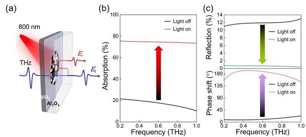 图1:(a)太赫兹脉冲在二氧化钒薄膜与氧化铝衬底中传播的示意图;(b)光控二氧化钒薄膜的太赫兹吸收率变化实验数据;(c)光控二氧化钒薄膜的太赫兹反射率与反射相位变化实验数据。