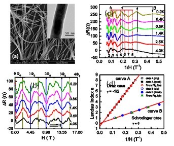 该研究成果在国际上首次实现在同一个单晶纳米线上既观察到平行磁场下的AB量子振荡又观察到垂直磁场下的SdH量子振荡,且AB振荡的周期为一个磁通量子,而SdH振荡朗道量子指数与磁场倒数的关系出现截距=-1/2. 这些结果不仅给出表面态的双重证据而且实验给出了拓扑表面Dirac电子的信息。
