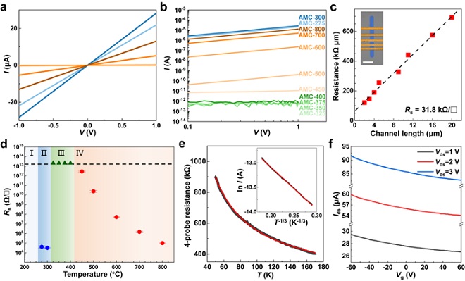 在电学性质的测量中,研究人员发现了AMC材料的高度温度依赖特性:在较低温度下(275-300 ℃)AMC具有微弱的中程序而呈现高导电性(方块电阻Rs: 32kΩ/persquare)、325 ℃得到的样品则变为绝缘态、进一步升高温度后,Rs与生长温度负相关。研究人员最终实现了AMC导电性在9个数量级中的连续可调。SHMFF的变温霍尔测量为确定样品的导电行为提供了重要证据。