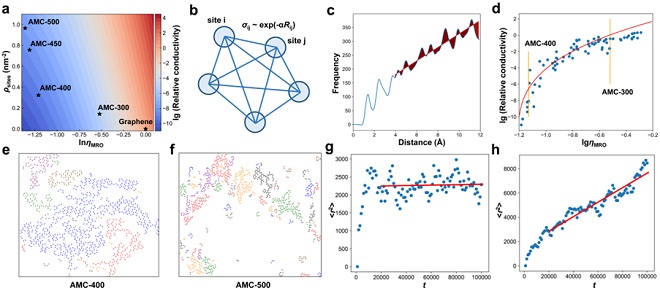 研究人员利用密度泛函理论计算和蒙特卡洛计算成功关联了二维非晶碳的原子结构和电学性质,揭示了AMC导电性差异的微观机理:AMC-300与AMC-400导电性差异的主要来源是中程序的有无;AMC-400和AMC-500的中程序差异不大,其导电性的差异则主要源于纳米晶区域的密度。为此,研究人员引入了一个新的结构序参量—跳跃岛密度;结合中程序,成功绘制了“微观结构-宏观导电性能”相图。这一发现也表明了非晶材料无序度的复杂性,难以直接用中程序完备描述其构效关系。该工作首次在一个非晶材料实例中实现了精准的构效关系,为二维材料、非晶材料物理及应用等领域提供了全新思路。