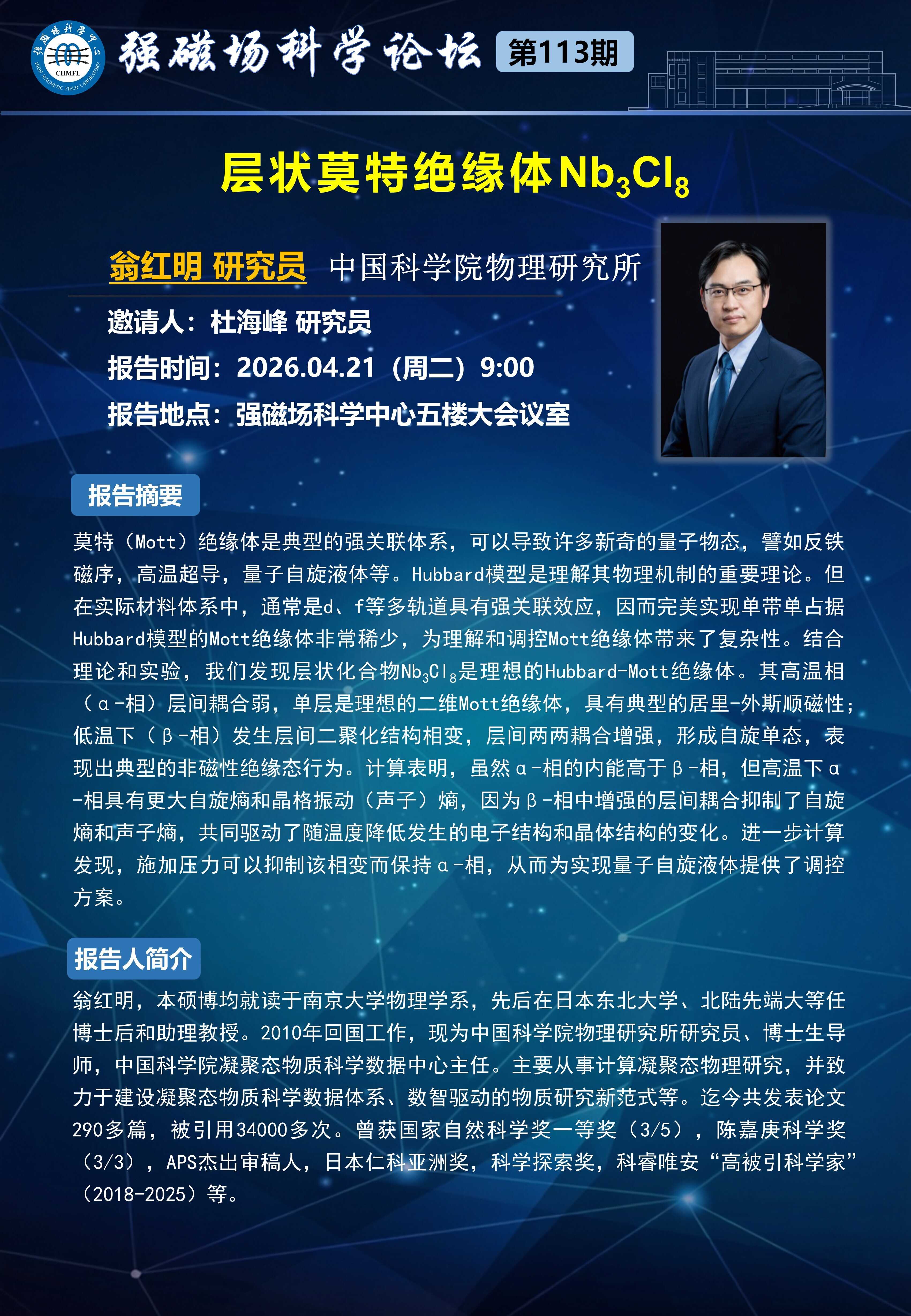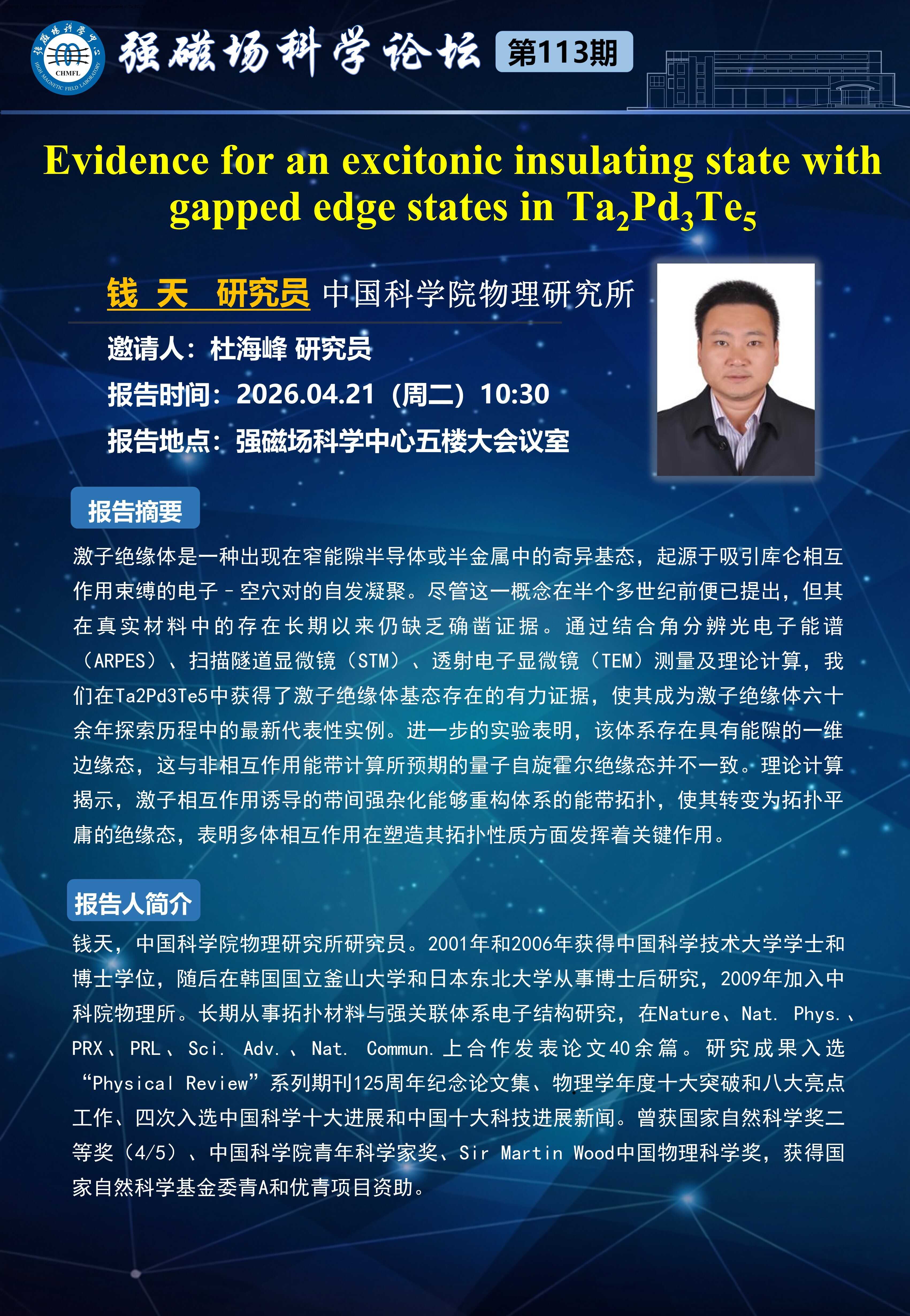 强磁场科学论坛第13期:层状莫特绝缘体Nb3CI8; Evidence for an excitonic insulating state with gapped edge states in Ta2Pd3Te5
