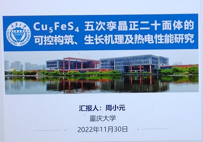 11月30日,强磁场科学中心邀请了重庆大学周小元教授做客低功耗量子材料建制化科研平台,会议线上线下同步进行,周教授作了题为“Cu5FeS4五次孪晶正二十面体的可控构筑、生长机理及热电性能研究”的报告。报告会由杜海峰研究员主持,众多老师和学生参加了报告会。