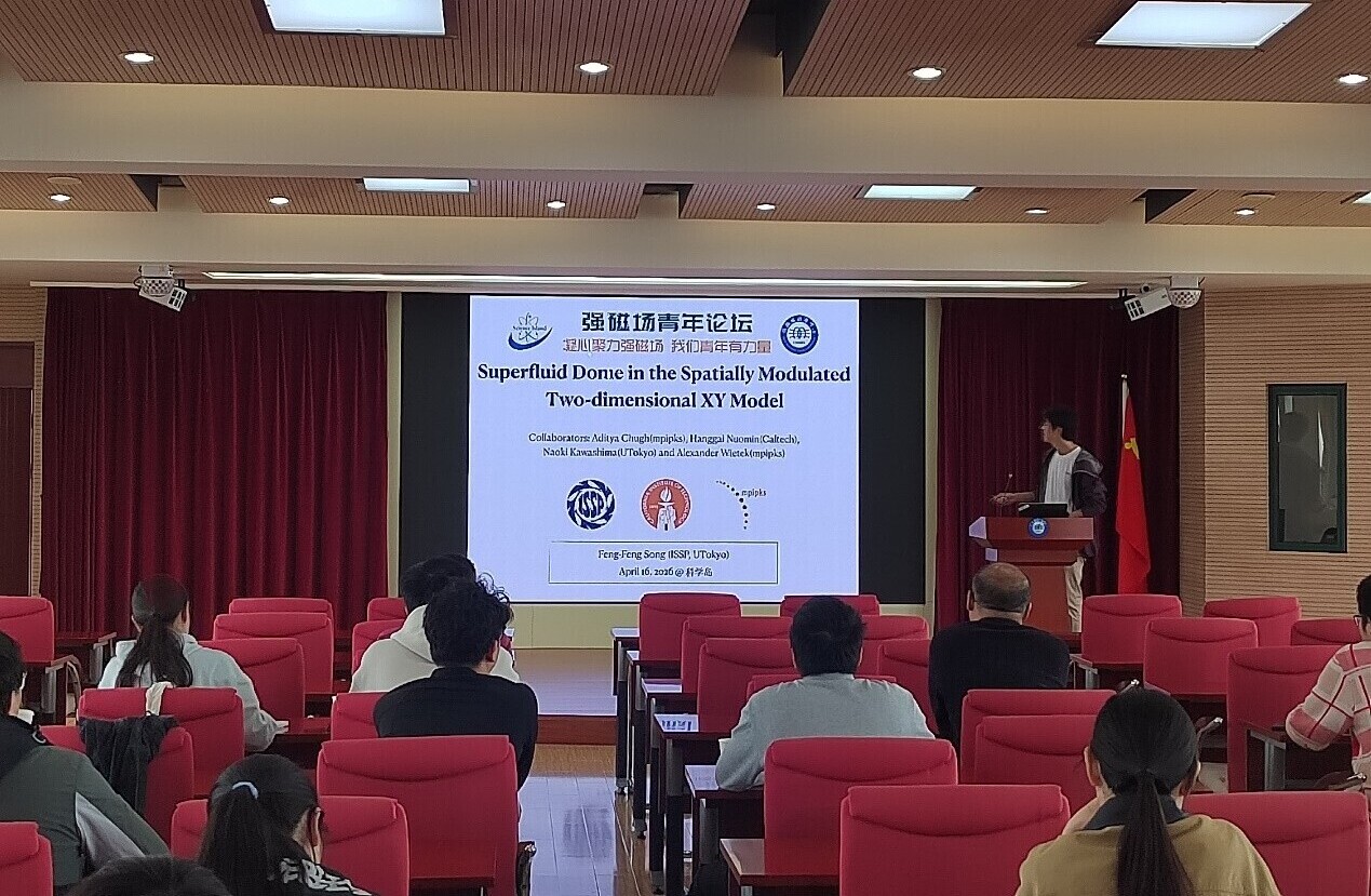 4月16日,强磁场青年论坛第76讲在强磁场中心五楼大会议室举行。东京大学物性研究所JSPS特任研究员宋峰峰受邀为大家带来题为"Superfluid dome in the spatially modulated two-dimensional XY model"的学术报告。中心青年职工和学生参加活动,活动由周旭光副研究员主持。