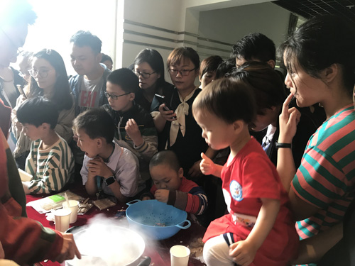 孩子们在科技周活动中不仅能听、看、摸,而且还能吃,在低温组开展的活动“液氮与美食”环节,经过温度为零下196摄氏度的液氮迅速降温的棉花糖、饼干、薯片等吃到嘴巴里那是一个凉爽。志愿者们还现场演示了利用液氮制作冰激凌的过程,加之简洁的讲解,让孩子们了解到:哦,液氮原来是这么回事。