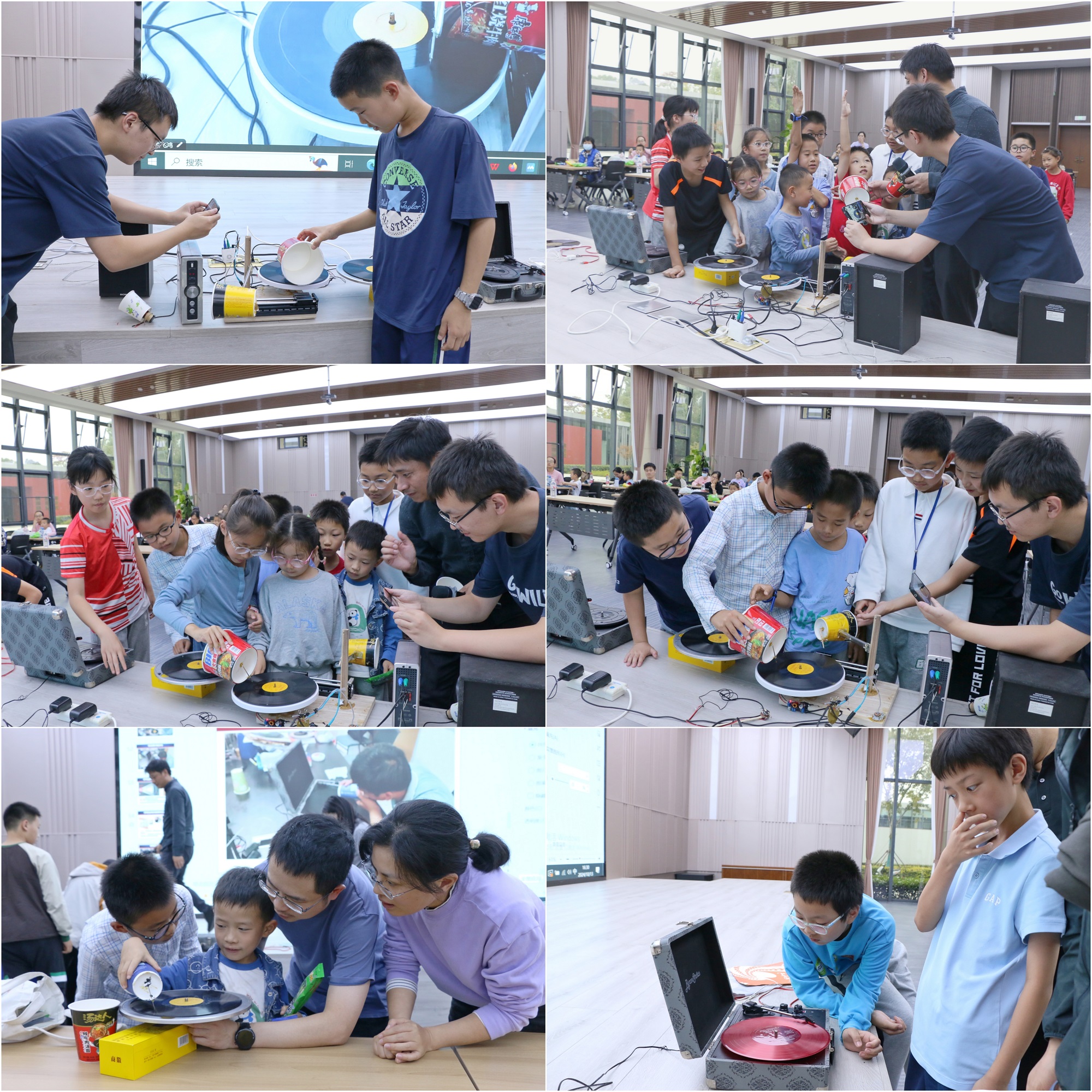 紧接着,朱相德以“声音是什么”为主题,带领孩子们踏上了一场声音的探索之旅。从声音的基本概念、历史渊源,到其产生原理、传播特性,再到声音在民用、军事乃至医学、工业领域的广泛应用,他讲解得既全面又通俗,充分展示了声音如何从简单的物理现象演变成为人类生活中不可或缺的一部分。此外,朱相德团队通过现场演示简易振膜唱片机、操作唱片留声机等互动环节,让孩子们不仅学习到了声音背后的科学原理,还在亲身体验中激发了强烈的参与感与探索欲。