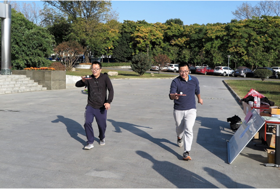 运动会首先进行个人赛的比拼,参赛选手们八仙过海,各显神通。自行车慢骑比赛中,张帅同学力压群雄,接连战胜多名对手,赢得大家的满堂喝彩。另一边,在运球的比赛中,李何轩同学开局不顺,但在大家的加油打气中,他不断进步,最终战胜了对手。赛后,他说道:“运球看起来挺简单,可一旦实践起来,也会出现蛮多意外。”比赛如此,科研亦如此。另一侧的比赛场地上,王哲和孟智的组合在你投我接比赛中,配合默契,获得了19分(满分20分)的优异成绩。在摸着砖头过河的比赛中,宋猛和李智浩两位的PK颇为激烈,双方你追我赶,交替领先,周围喝彩加油声不断,最后宋猛同学以微弱的优势获胜。